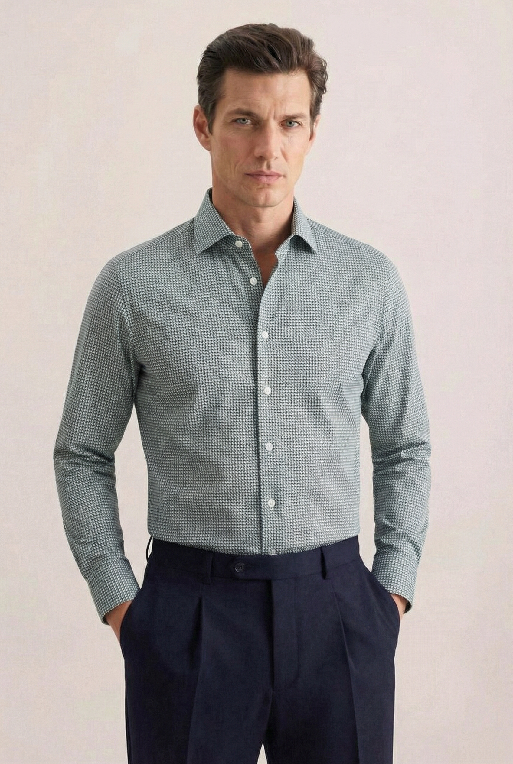 • Приталенный силуэт, Классический воротник, Классический (на пуговице), Принт, Синий